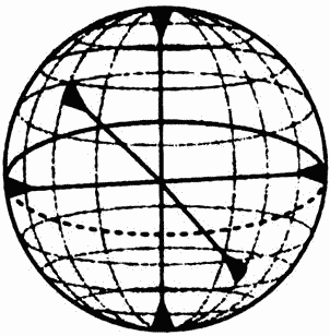 — Това е общоприетият символ за Великата машина — каза Магьосника. — Сега, както правилно си разбрал от бележките ми, Машината е просто нашата планета. Както показва скицата, на шест места по планетата има шест подземни светилища, с пирамидална форма, но обърнати, гигантски и сочещи надолу, към центъра на земята. Забележи шестте сочещи надолу пирамиди и обърни внимание на белите правоъгълни стълбчета във върховете им… Макар Машината на този чертеж да е обикновена двуизмерна рисунка, представи си я в три измерения, като шестте върха се намират точно под повърхността на Земята и са пръснати по сферичната планета. Ето така… — И той начерта груба скица.