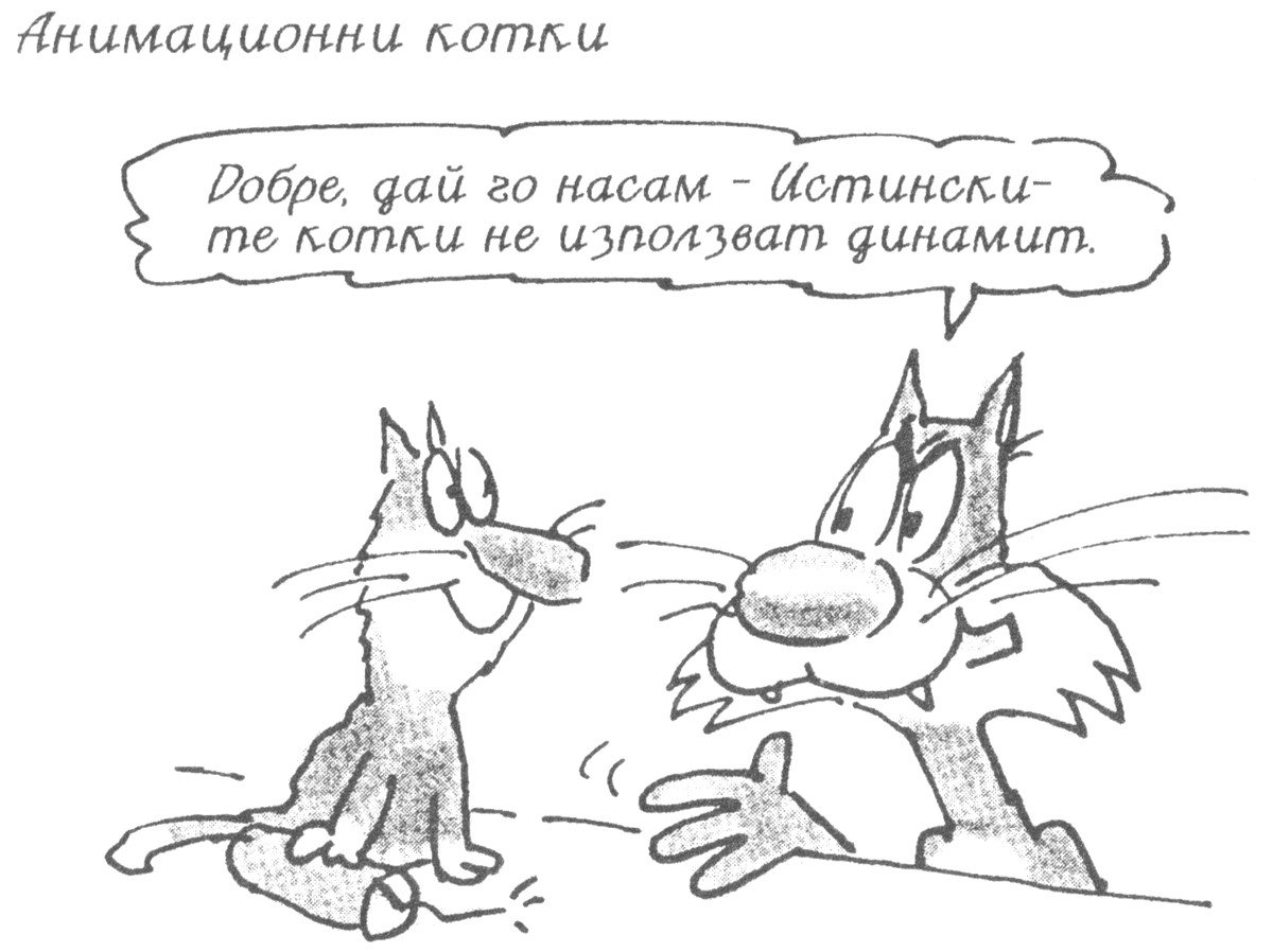 Обикновено са черно-бели и често притежават забавен говорен недостатък. Ако котката ви може да чете вестници, то тя е анимационна котка. Ако може да докопа пръчка динамит, като просто посегне извън екрана, то тя е анимационна котка. Ако носи папийонка, значи е анимационна котка. Ако, когато побегне, краката й няколко смешни секунди се въртят във въздуха като колело и правят „бинка-бинка-бинка“, то тя е анимационна котка. Ако все още се колебаете, проверете дали съседите нямат булдог на име Буч, който има нашийник с шипове и обикновено може да бъде намерен дремещ пред колибката си. Ако имат, ще разберете що за котка си имате.