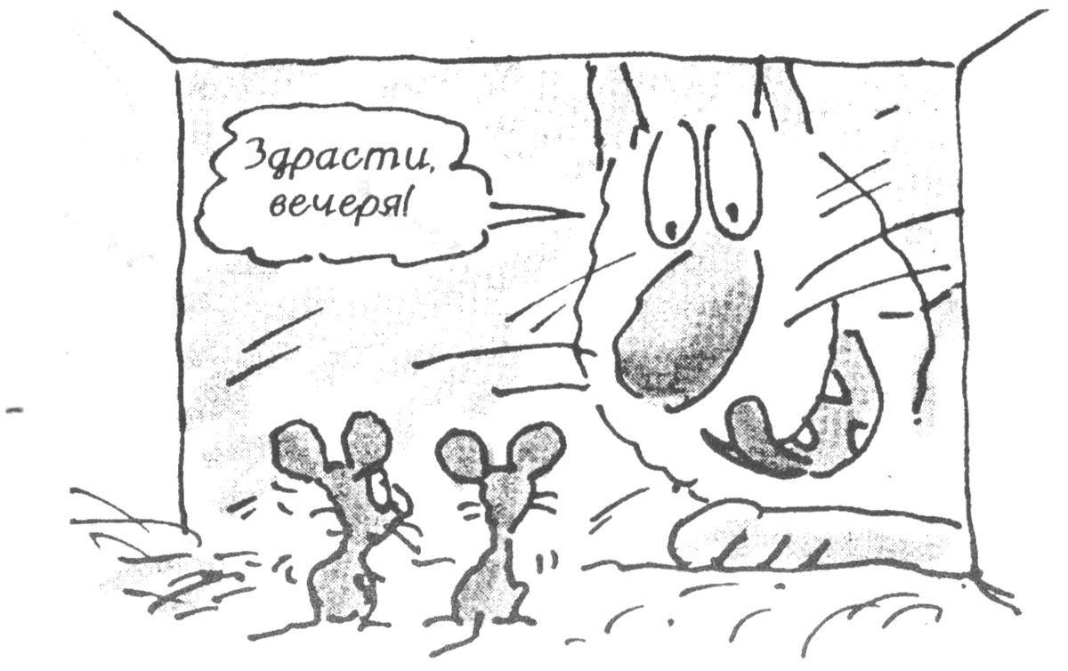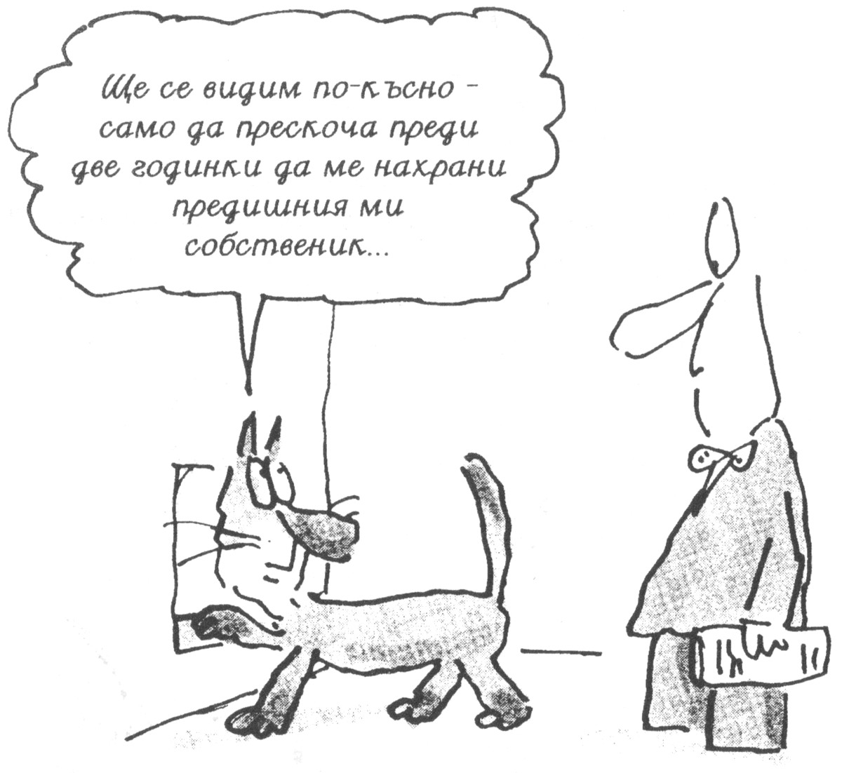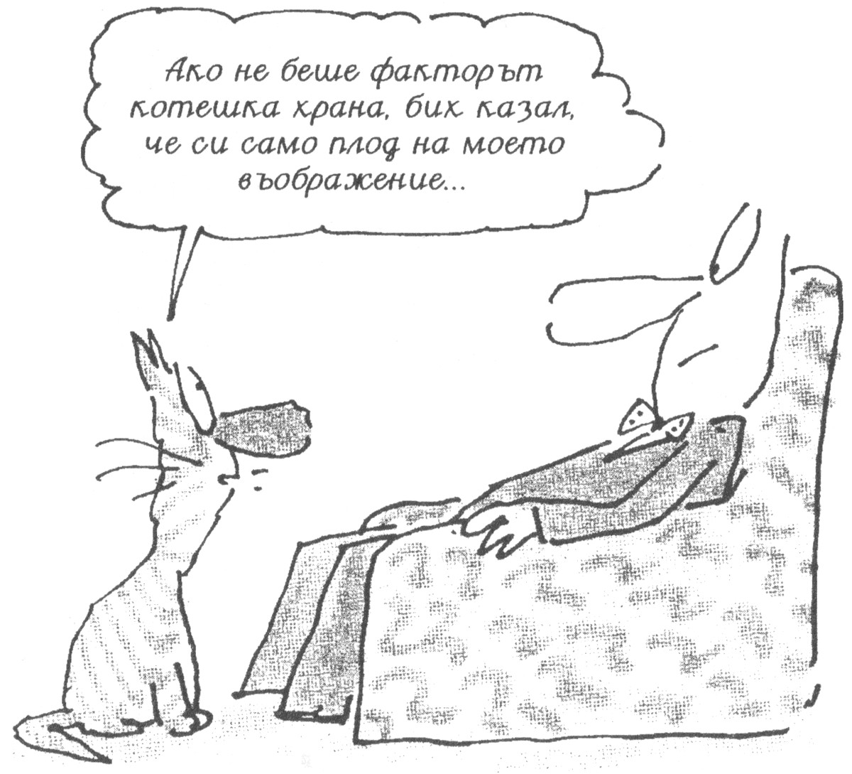 Отключваме вратата. Котката вече не се вижда никаква. Търчим от стая в стая. Хиляди уплашени очички се взират в нас от жилищния блок от клетки, в който се помещава хамстерската колония: дори и сексът не е толкова интересен, колкото да гледаш как плувнал в пот, луднал човек по халат се щура из стаята. Търсим под леглата. Поглеждаме през прозореца и виждаме как Истинската котка си крачи по алеята.