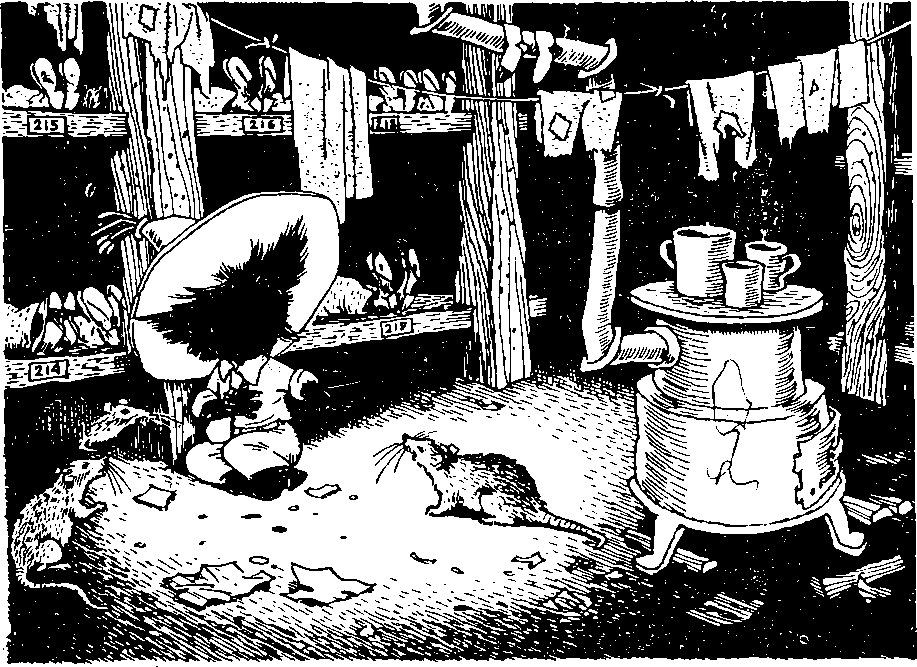 — Какво сте се разприказвали там за плъхове? Нямате ли за какво друго да говорите? — извика едно дребосъче, което лежеше на горния нар. — Ей сега ще сляза и ще ви запуша устата!
