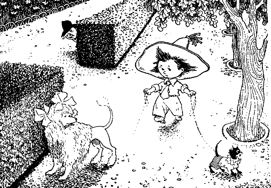 С тези думи тя откачи синджирчето от нашийника на пудела. Освободен от синджира, пуделът бавно тръгна към дребосъчетата и почна да ги души едно по едно. Когато се приближи до Незнайко, той, неизвестно защо, много се заинтересува от обувките му: мириса ги продължително, след това вирна глава, близна Незнайко право по бузата и клекна пред него на пода.