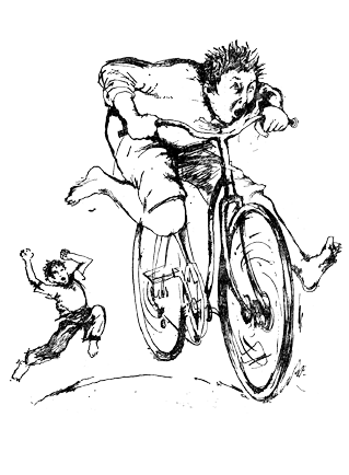 Томи скимтеше недоволно, но остана да пази багажа. Взеха едно дамско колело, което им беше таман. Като го бутаха и тичаха, двамата отидоха на съседната улица, далеч от погледите на Рекорд, Пръв, разбира се, се качи Фильо. Той потегли, а Макензен тичаше покрай него. Не мина обаче много време — насреща се изпречи каруца. Фильо зави рязко и двамата с Макензен се стовариха на тротоара един върху друг. Скочиха и се изтупаха от праха. Макензен беше непреклонен. Бе негов ред.