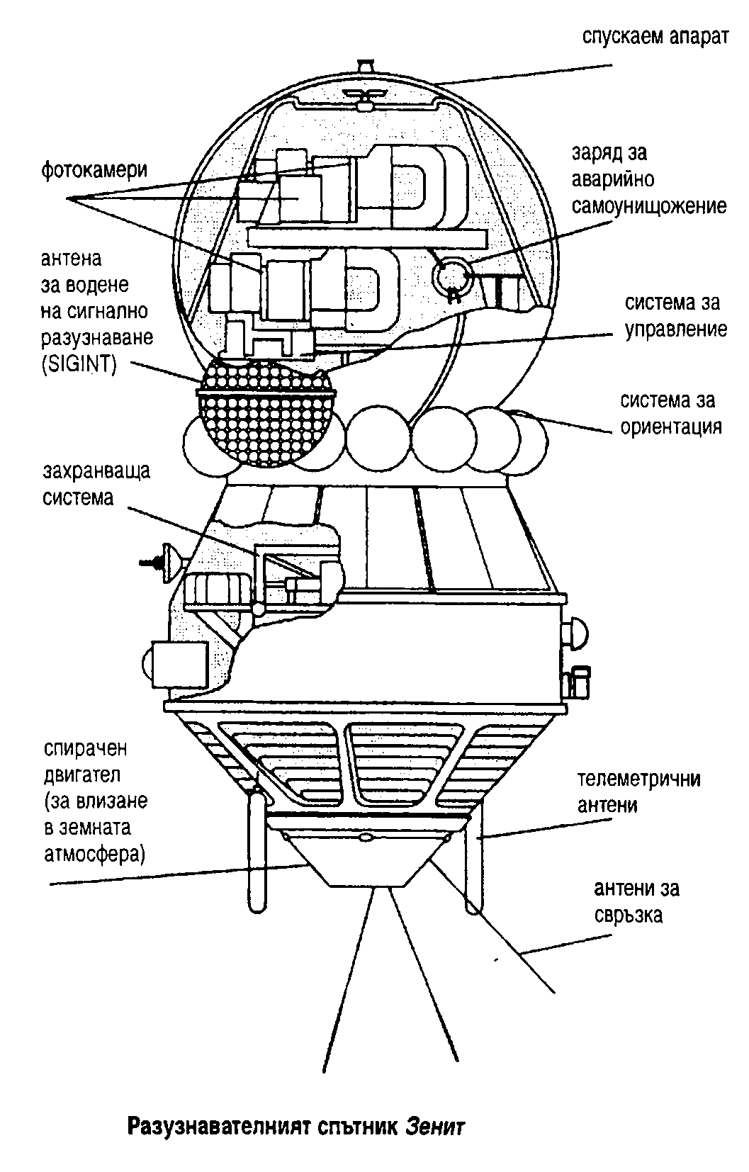 Първият съветски фоторазузнавателен СПЪТНИК. Въпреки че е изведен в орбита две години след първия успешен американски спътник КОРОНА, в някои отношения Зенит е по-съвършен.