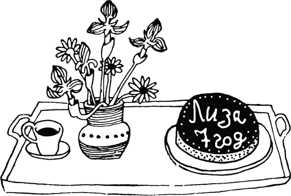 Най-сетне чух тропот по стълбата и замижах с всички сили. И после — тряс! — вратата се отвори и влязоха татко и мама, и Ласе, и Бусе, и Агда, нашата домашна помощничка. Мама държеше подноса. Върху него стоеше чаша какао и ваза с цветя, и голяма торта със стафиди и захарна глазура, върху която пишеше „Лиза 7 години“. Агда я беше изпекла. Но нямаше никакви подаръци и си помислих какъв ли ще е този странен рожден ден. Обаче тогава татко каза: