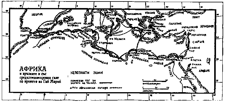 И така войската се придвижваше в своята десеткилометрова колона право към западните части на Нумидия, войниците пееха с пълно гърло своите бойни песни — хем да изравнят крачка, хем да почувстват какво значи воинска солидарност; всички вървяха заедно, пееха заедно — като една огромна човешка машина, която помиташе всичко по пътя си. По средата на колоната маршируваше самият Марий заедно с целия си щаб, мулетата и каруците, които носеха бойното им снаряжение, и всички заедно пригласяха на войниците; никой от висшите началници не яздеше кон, защото това уморяваше повече от ходенето и ги правеше забележими от километри; за всеки случай обаче всеки от офицерите имаше по едно животно близо да себе си, така че в случай на внезапно нападение генералът да наблюдава сражението от по-високо, а помощниците му — да предават по-бързо заповедите му.