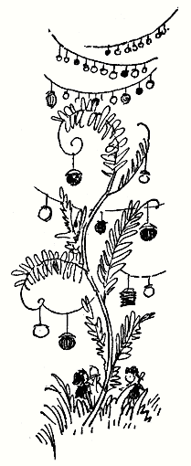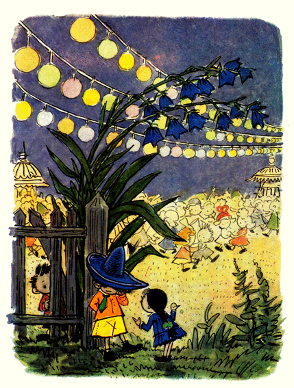 На другия ден се състоя балът, очакван с голямо нетърпение от всички. Около танцувалната площадка пъстрееха празнично украсени будки. Техните ярки цветове ги правеха да приличат на медени къщички, покрити с цветна захар. Над площадката бяха опънати връвчици, по които висяха разноцветни фенерчета и флагчета. Такива фенерчета и флагчета бяха окачени и по всички дървета наоколо. Всяко дърво приличаше на празнично украсена новогодишна елха.