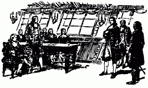 Ричард Томпсън слушаше островитянина с напрегнато внимание. Един час преди това събрание той беше освободен от своя карцер и едва бе успял да сложи в ред собствения си тоалет, а също така да снабди и островитянина с подобаващ за случая костюм.
