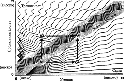 Фигура 14.4. Етапите по пътя към достигане на състояние на прилив — екстаз на висока продуктивност и блажено удовлетворение.