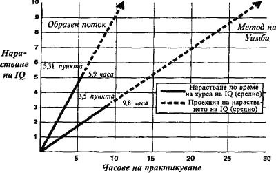 Както в началото на курса, така и след него, Райнърт направил на всеки студент от двете групи тест за измерване коефициента на интелигентност. Резултатите били не само неочаквани, но и направо поразителни (виж Фигура 2.1). Студентите, които използвали при обучението си метода на Уимби, увеличили коефициента си на интелигентност средно с 0,4 пункта за всеки час практика. Докато онези, които се обучавали чрез техниката за отприщване на образния поток, увеличили коефициента си на интелигентност средно с невероятните 0,9 пункта за всеки час практика — тоест, „поумнявали“ с цял един пункт за всеки осемдесет минути практикуване на техниката! (Резултатите от този пръв експеримент на Райнърт в тази насока все още не са оповестени в научна публикация, поради което трябва да бъдат смятани за предварителни. Окончателните резултати и изводи ще бъдат публикувани, след като ученият приключи провеждания понастоящем дългосрочен експеримент.)