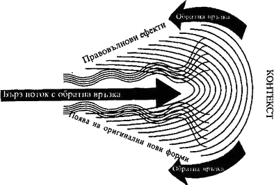 В този смисъл оригиналното мислене се поражда до голяма степен като правата звукова вълна. Докато сетивните ни усещания се пресрещат, наслагват и преливат в примки за обратна връзка, образувани от бързо нахлуващи все нови и нови възприятия, мисловният процес на левия ни ум се нарушава и „счупва“, а от хаоса на сблъсъка се пораждат „правите вълни“ на ново творческо прозрение под различни изненадващи и оригинални форми (виж Фигура 5.1).