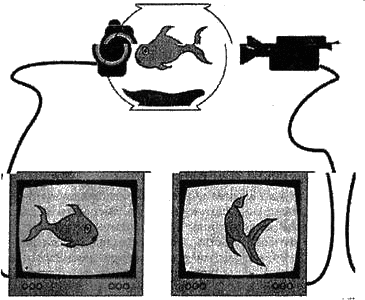 Фигура 7.1. Физикът Давид Бохъм оприличава света извън рамките на нашите пет сетива на аквариум, който е скрит от погледа ни. Ако чрез две насочени под различен ъгъл видеокамери наблюдаваме плуваща в него риба, ще ни се струва, че гледаме две различни риби, чиито движения по някакъв загадъчен начин влизат в пълен синхрон — така, както ни се струва, че си взаимодействат квантовите частици, независимо от делящите ги сякаш безмерни пространство и време. Айнщайн нарича това поведение на квантите „призрачна връзка от разстояние“. Бохъм предполага, че в действителност при тази „призрачна“ взаимовръзка всъщност става дума за един-единствен квант, който — подобно на рибата в аквариума — само изглежда като две отделни частици, намиращи се на две различни места, поради несъвършената способност на нашите сетива да доловят „скрития ред“ (както нарича той невидимия свят).