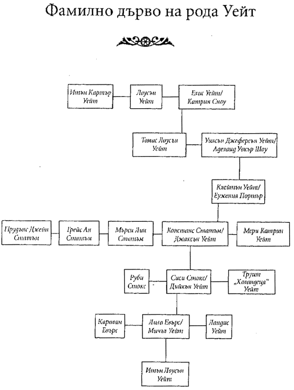 — Повечето родословни дървета на южняшките фамилии са пълни с лъжи, но съм изненадана, че са успели да го заличат от всички копия на фамилното дърво на Уейт — каза леля Грейс и затръшна така албума, че в кухнята се вдигна плътен облак прах.