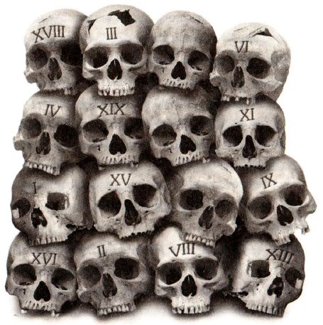 Не им отне много време. В купчината кости бяха вместени шестнайсет черепа, разположени в четири редици и четири колони. Три от черепите бяха без цифри. Останалите бяха номерирани. Изглеждаха така: