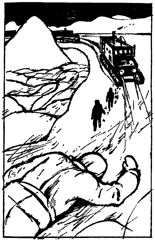 А сега вятърът се усили до десет метра в секунда и вдигнатите във въздуха снежинки унищожиха всякаква видимост. Наложи се водачите да спрат: коловозът изчезна и те рискуваха да свърнат встрани и да се заблудят или да се блъснат в предния. Много неприятно явление е по време на поход виелицата, отнетата видимост. На два-три метра над повърхността се стеле пелена. Като се качиш в кабината, над тебе е чисто небе, ясно и спокойно, и имаш впечатление, че си затънал до кръст в сняг. Спуснеш ли се долу; напълно загубваш ориентировка всред заобикалящата те бяла мъгла. Обсипвай с проклятия природата, но търпи и чакай: щом няма видимост, не изкушавай съдбата! Докато бръска виелицата стой и чакай.