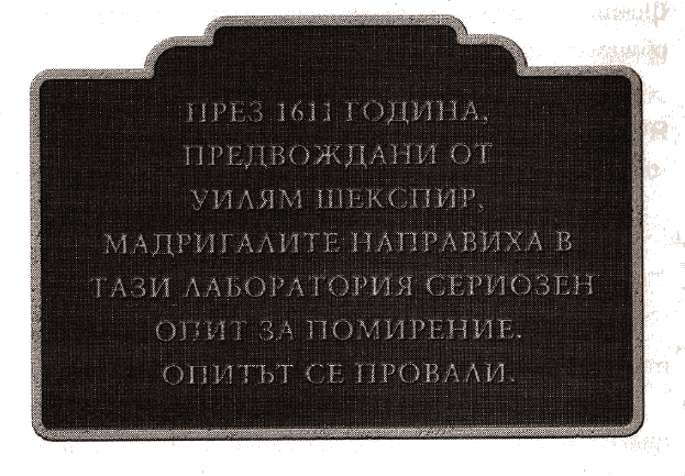 Затича се. Усещаше смътно, че и други бягат до него — ту го изпреварват, ту изостават. Мяркаха се стаи и Дан зърна още плочи: ОПИТ ПРЕЗ 1783 ГОДИНА… ОПИТАХМЕ ОЩЕ ВЕДНЪЖ ПРЕЗ 1848 ГОДИНА… ОЩЕ ЕДНО УСИЛИЕ ПРЕЗ 1914 ГОДИНА… Момчето не спря, за да ги прочете внимателно, но видя, че всички завършват по сходен начин: ПРОВАЛИХМЕ СЕ… КРАХ… ПЪЛЕН РАЗГРОМ… Всички помещения, през които притичваше, бяха унищожени: овъглени, срутени, взривени. Мадригалите се бяха стремили отново и отново да обединят семейството и всеки път се бяха проваляли.