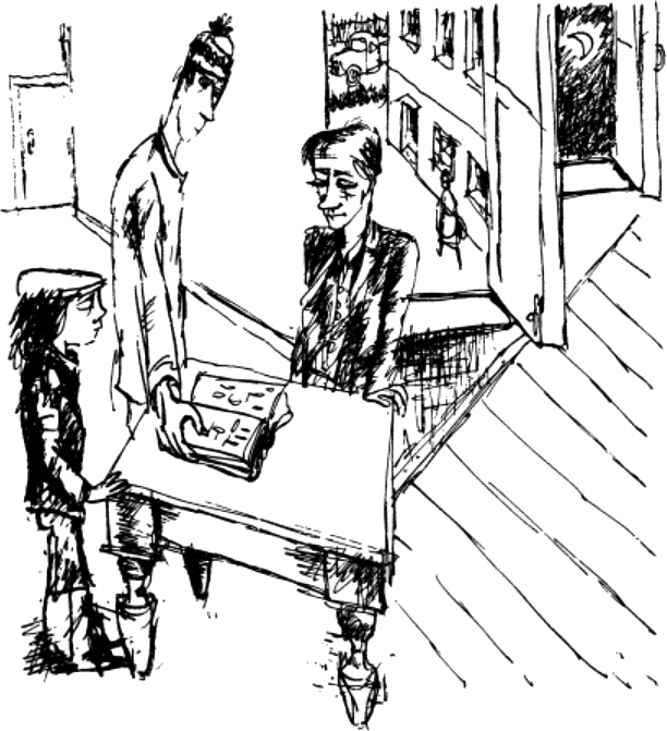 Наемателя въздъхна, свали от шкафа някакъв четириъгълен кафяв предмет, който наистина приличаше на възглавница, избърса праха с ръкав и го метна върху масата. От тежкия удар масата охна и приклекна.