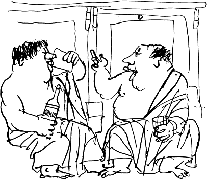 Срещу нас седяха двама, както се вижда, току-що излезли от парилнята. На ъглите на чаршафите, с които те се бяха наметнали небрежно, с черна боя беше отпечатано: Т. Б.