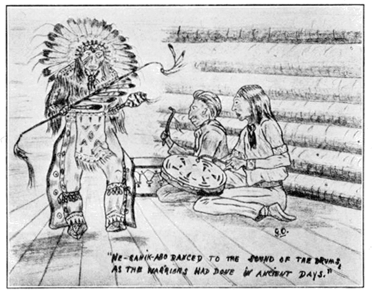 Изведнъж танцуващите освободиха стаята, насядаха в голям кръг покрай стените, сякаш очакваха някакво събитие, и се смълчаха. Не след дълго в кръга се настаниха двама мъже с тамтами и започнаха да ги бият. Тогава през вратата влезе старият Ни-Ганик-Або — човекът, който стои начело на своето племе — с голямо украшение от орлови пера на главата и странни, дивашки шарки по лицето и затанцува под звуците на тамтамите. Под колената му висяха нанизи от кухи еленови копита, които се удряха и хлопаха при всяка стъпка, а в ръката държеше дрънкалка, направена от цяла черупка на костенурка, боядисана в черно и червено, с главата и шията на костенурката за дръжка. И когато танцуваше, кухите еленови копита сякаш звънтяха като медени звънчета в такт с бързия ритъм на краката и ресните на панталоните му се друсаха, орловите пера се събираха и разтваряха в безупречен такт с тъпаните, които неспирно биеха, и както танцуваше, тръскаше дрънкалката. И в същото време пееше с нисък глас странна монотонна песен, в която се разказваше за приключенията на Сейджо и Шапиън, на Чилауи и Чикани, също както в стари времена, когато воините са редели песни за битките. И след всяка строфа група певци подхващаше припева; тая песен имаше чудновата, заразяваща мелодия, която неудържимо увличаше.