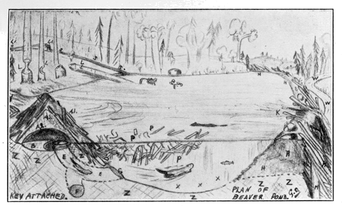 (A. 1, A. 1) Бобров дом (A. 2) Вътрешност на дома. Стаята или жилището (B.) Площадка за спане (C.) Долна площадка за изсушаване, оттичаща се в гмуркалото на D (D.) Гмуркало (E, E.) Тунел, водещ към дълбоките води (F.) Страничен вход за непредвидени случаи, използуван и за изхвърляне на стара постилка и ненужни пръчки. (G.) Главен вход (H, H.) Яз (K.) Преливник за регулиране на оттичането и за поддържане необходимото равнище на водата. (L, L. и L, I.) Повалени или отчасти повалени от бобрите дървета (M, M.) Дъното на вира (P, P.) Сал за хранене. По-голямата част под водата, където не стига ледът (S, S.) Улей или влек, използуван от бобрите за спускане на части от прегризани от тях дървета, отбелязани с L, I. (W, W.) Продължението на потока под яза (У.) Втичането във вира на потока, който изтича на K. (X, X.) Дъното на вира, издълбано под сала за хранене и пред яза, за да се добие по-голяма дълбочина на водата. Добитият по този начин материал се използува за изграждането на яза и дома. (Z, Z.) Суха земя преди завиряването, сега под вода поради яза. Без яза нямаше да има вир, а само поток.