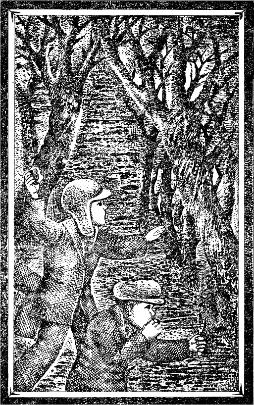 Тадек се покатери на най-високия бор и седна на един клон да си почине. Оттук добре се виждаха техните позиции. Ето там, зад червения берберисов храст е клекнал Юрек и подбира камъчета за предстоящата битка. Няколко крачки по-наляво Стефек пълзи към Зимек. Вероятно носи някаква заповед от вожда, който скрит зад бора на възвишението наблюдава зорко всичко. А там, зад зеления хвойнов храст блести русата, винаги разрошена коса на Кажик.