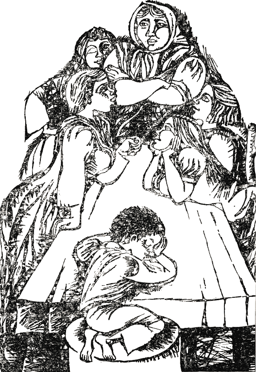 На масата седнаха и сънените Вера и Сима. Сега около голямата квадратна маса всички места бяха заети. Седяха един до друг — натясно. От само себе си стана така, сякаш само Валка е липсвал, та плътният жив пръстен да се съедини. Той се намери между леля Лиза и Ленка. През масата, точно отсреща, седеше Клава. Най-после тя млъкна, подпря глава на ръцете си и мрачно загледа покривката.