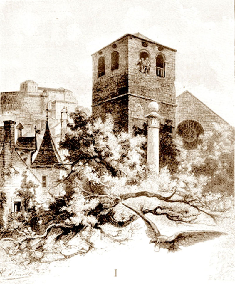 Гълъбът явно беше съвсем изтощен. Той кацна на корниза на катедралата, до която се издигаше много по-стара, висока четвъртита кула. Като не можеше вече да се задържи, той застана най-напред върху покрива на една малка ниша, където беше подслонена статуята на свети Юстин; но отмалелите крачка не можаха да го задържат там. Птицата се отпусна и се плъзна до капитела на една антична колона, поставена в ъгъла между кулата и фасадата на катедралата.