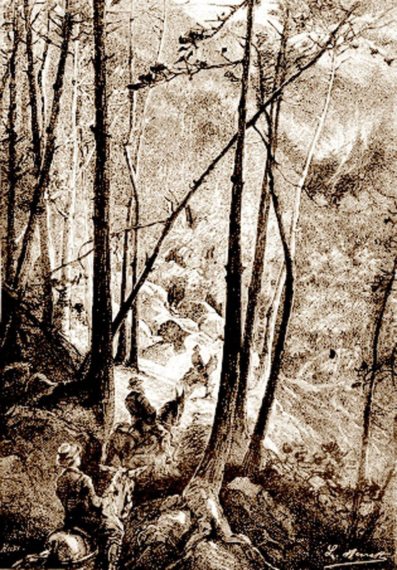 Още преди пет часа докторът, Петер и водачът изкачиха с мулетата си втория пояс от масива — гористата зона. Не че дърветата са многобройни, защото дърварите и тук, както навсякъде, се трудят за унищожението на великолепните стари гори, които ще се превърнат скоро само в митологичен спомен. Но тук-таме, на кичури или на групи, покрай потоците от лава, накрай пропастите растат все още буки, дъбове, смокини с почти черни листа, а в малко по-високите местности — борове, ели и брези. По самата пепел, смесена с малко хумус, растат кичури папрат, росен и здравец или килими от мъх.