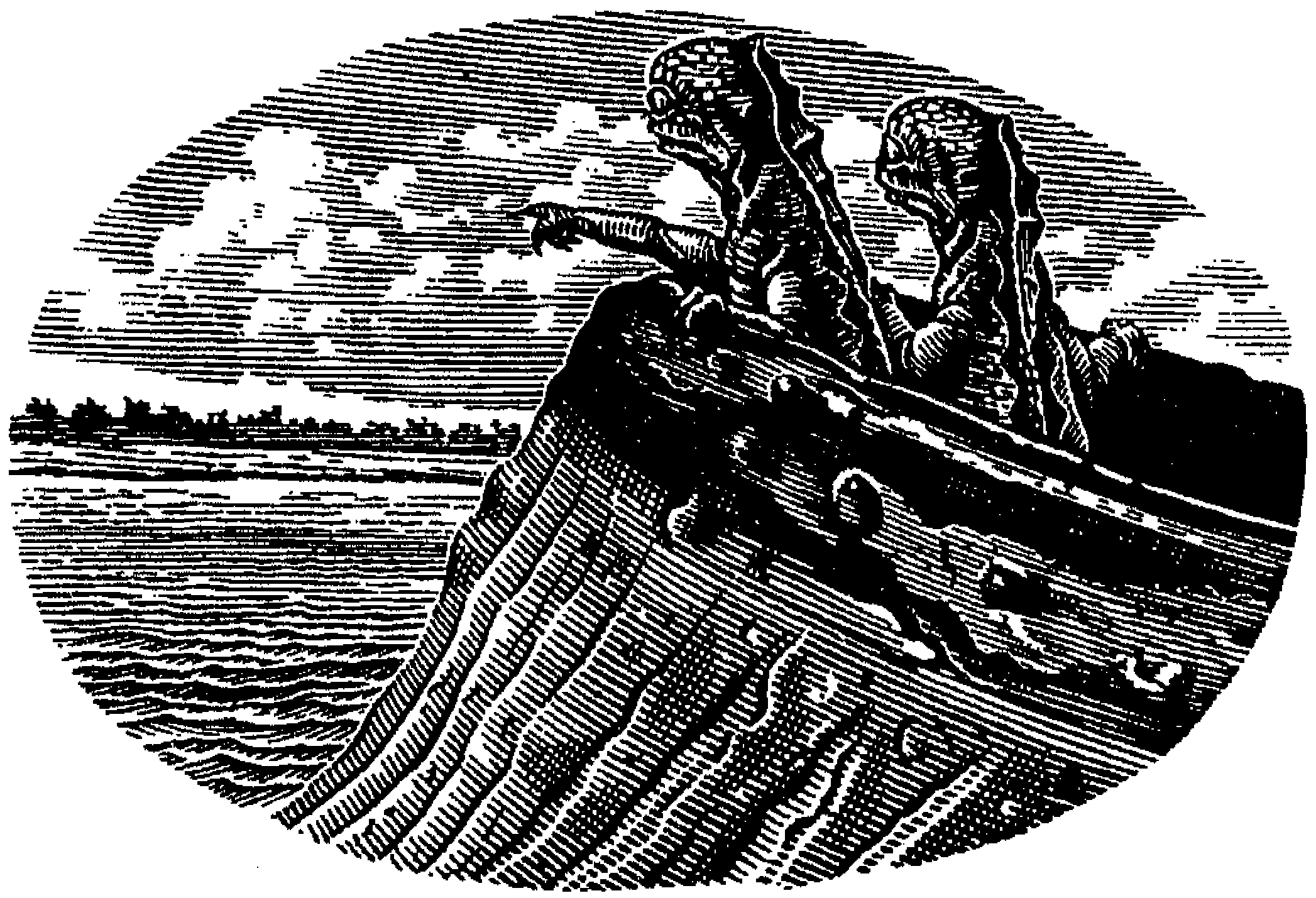 На този девствен бряг нямаше док, накараха урукетото чрез подмамване с прясна риба да прокопае канал в калта със зъбатата си човка. Хранеха го добре и то държеше главата си заклинена в канала, който издълба. Те пристъпиха внимателно върху плъзгавата му кална кожа и се покатериха към гръбната перка. Кръглото, защитено от кости око на урукетото се размърда леко, когато минаха край него. Забиваха пръсти и ноктите на краката си в грубата кожа и се катереха. Енге вървеше много бавно, за да не изпреварва възрастната учена.