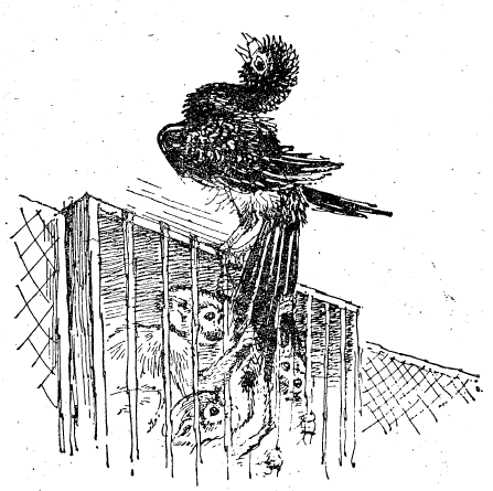 Докато вършех това, Кутберт направи няколко опита да подскочи на скута ми, но аз го предупредих най-категорично и в края на краищата той се отдръпна и в продължение на няколко минути размишляваше много задълбочено за нещо. Той реши, че бавното приближаване към мен не е успешно, затова се опита да ме изненада. Издебна ме, когато не гледах към него, изправи се и се опита да кацне на рамото ми. Разбира се, пропусна мястото на кацане и падна върху масата с разперени крила и силен изплашен писък и обърна за втори път мастилницата. Той недвусмислено разбра колко много ме ядоса това, отдръпна се в единия ъгъл на стаята и остана намусен там.