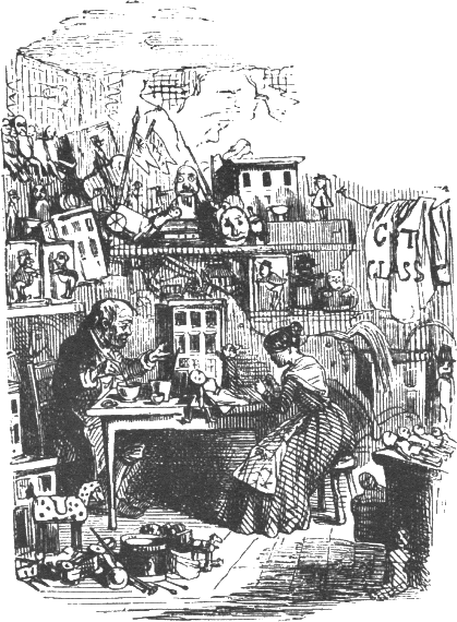 Кейлъб и дъщеря му работеха както всеки ден в работилницата, която беше и тяхна дневна, а това бе необичайно за обикновения човек място. Вътре можеха да се видят къщички — завършени и не съвсем, кукли с различно положение в обществото, квартири от покрайнините за кукли със средни финансови възможности, кухни и едностайни жилища за кукли от най-нисшата класа, прекрасни градски резиденции за кукли с високо обществено положение. Някои от кукленските къщи бяха вече добре мебелирани в съответствие с цената си, докато други притежаваха само най-необходимото за тези с по-малки доходи. Някои се подреждаха по поръчка скъпо и луксозно със съответните столове, маси, легла и дивани, които чакаха подредени по лавиците. Фигури на аристократи, дребни благородници и хора от народа, за които бяха предназначени тези жилища, лежаха тук и там в кошници с очи, вперени в тавана. Но като ги ограничаваха в съответния им социален кръг (което, ако се вярва на опита от реалния живот, е изключително трудно), майсторите на тези кукли доста подобряваха вродените им дадености, а известно е, че Природата понякога е доста своенравна. Те не разчитаха само на атлаза, шарения памучен плат и разни парцалчета на цветя, а добавяха такива различия в образите на отделните кукли, че да не стават грешки. Така например куклата — дама от доброто общество, имаше напълно симетрични восъчни крайници, запазени единствено за нея и себеподобните й; куклите от следващото по-ниско стъпало бяха от кожа, а онези от по-долното — от груба памучна материя, докато ръцете и краката на най-обикновените представляваха просто дървени клечки кибрит. Така те оставаха завинаги в отредената за тях социална среда.