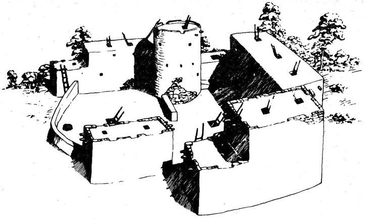 Реконструкция на едно от по-малките поселища в Меса Верде (селище № 499, около 1130 г., схематична реконструкция от Клифърд Меритю), която обаче има всички характерни белези на по-големите комплекси — етажен строеж, отбранителна кула, всички входове откъм покрива и наполовина вкопана в земята кива. Недостатъчното количество останки от дървени конструкции не дава възможност за дендрохронологична датировка, чиято възраст е известна от други находища, трябва да се предполага, че поселището е било обитавано главно между 1100 и 1150 г.