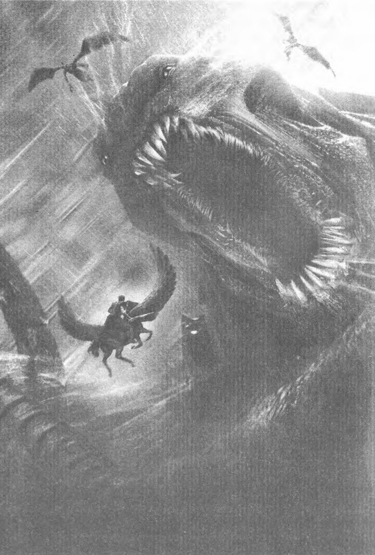 Чудовищното създание удари с опашката си и огромни вълни понесоха към епицентъра на въртопа си коня и ездача. Пегас бързо се окопити и не се поддаде на течението, а се върна обратно нагоре.