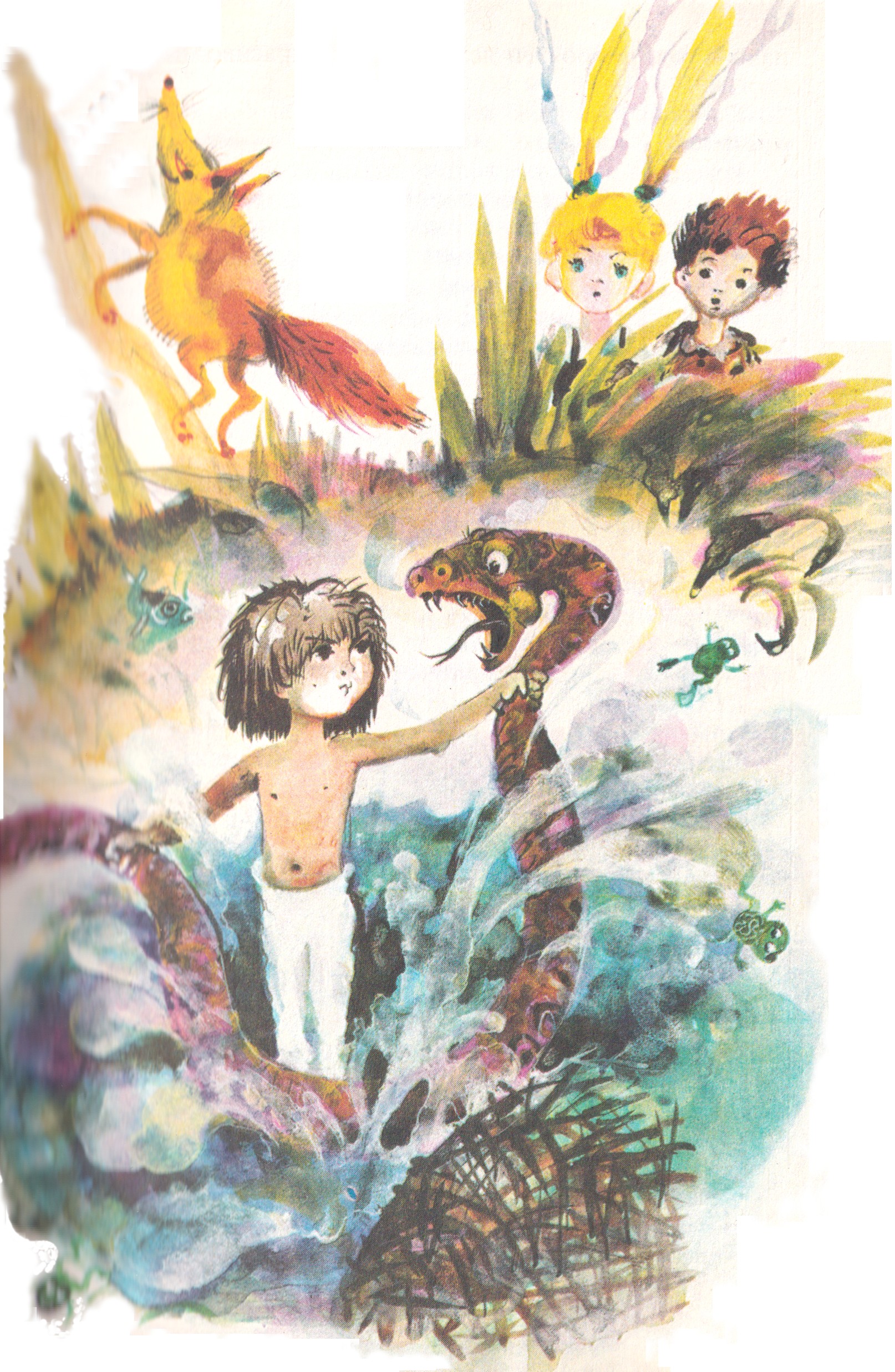 Шегобишко държеше здраво кошлето и гледаше змията право в очите. А когато една змия се гледа право в очите, тя престава да бъде змия. Нещо повече: тя се сви на дъното и запримига като ударена от гръм.