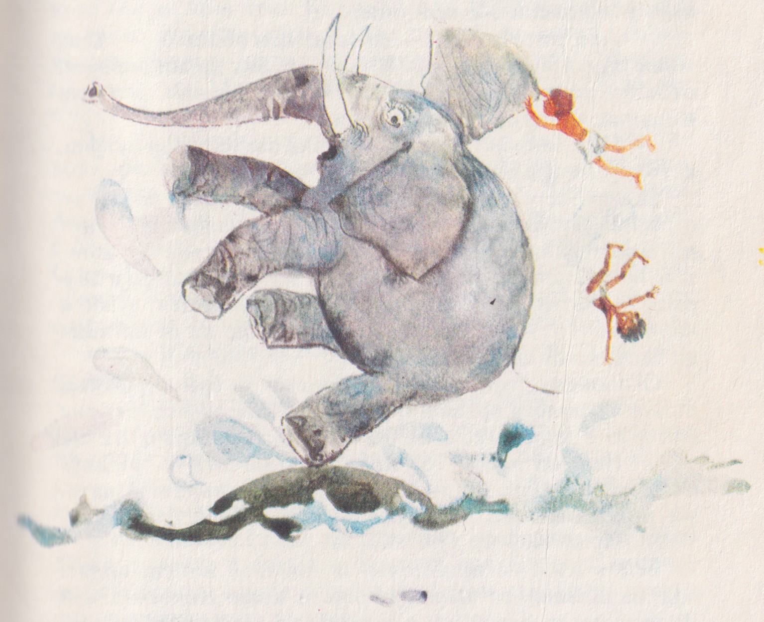 Ами сега — накъде! Слонът лежеше преобърнат по гръб в морето и риташе с крака. Смееше се и беше много радостен, тъй като никога досега не се бе къпал нагоре с краката. Като голям и добър слон, и при това бял, той не закачаше никого в джунглата, но и никой не се осмеляваше да го закача. Пасеше си кротко и мирно, радваше се на топлото слънце, въргаляше се в реката, играеше по цял ден с малките слончета и това беше всичко, което го правеше щастлив. В сърцето му нямаше чувство на страх.