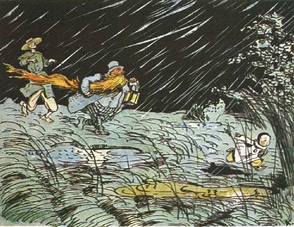 Една светкавица освети черния облак над главата ми и аз видях на десет крачки зад себе си да тичат Карабас Барабас и продавачът на пиявици… Помислих си: „Загивам“, спънах се, паднах върху нещо меко и топло, хванах нечии уши…