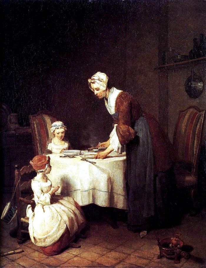 Жан-Батист Симеон Шарден (1699–1779) гради кариерата си на художник в Париж, между Рю дьо Сен, където е роден, и Лувъра, който обитава през последните две десетилетия от живота си. Овладява занаята в различни ателиета и на двайсет и осем години представя две картини — Риба скат и Бюфет, с които е приет в лоното на Кралската академия за живопис и скулптура. Риба скат извиква всеобщо възхищение и начаса му отваря вратите на авторитетната институция. Скоро той се утвърждава като най-бележития майстор на натюрморта на своята епоха. Бавно и усърдно композира малки платна, в които се подрежда светът без история на предметите, на домакинските съдове, изобразени грижливо и със старание.