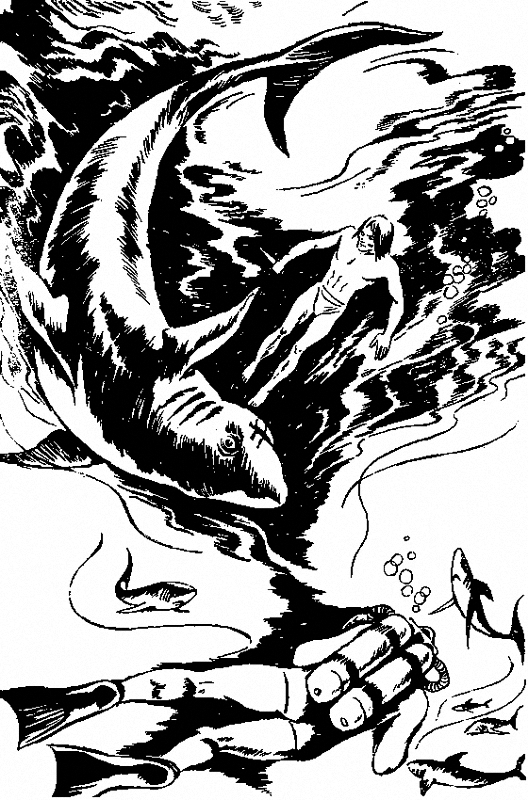 Бялата акула се устреми насреща му. Той отскочи назад. Но когато видя скованата й уста, се прехвърли над нея, обкрачи гърба й. Вдигна ножа. И не го заби. Досрамя го. Тя не му беше сторила нищо лошо, когато той беше беззащитен. И той трябваше да я пощади в нейната безпомощност.