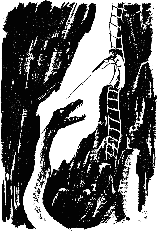 Исполинският гущер изправи глава в диво желание да докопа храбреца, който бе дръзнал да нахлуе във владенията му, ала не можа да го достигне. Тогава той изпълзя тромаво из водата и пак се надигна нагоре. Очите му святкаха от злоба, а от озъбената му уста се носеше несдържан глух рев, от който се тресеше пещерата.