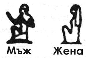 — Обърни внимание как мъжът седи с кръстосани крака и вдигната ръка, докато жената е седнала благопристойно. — Посочи последния знак. — Това със сигурност е жена.