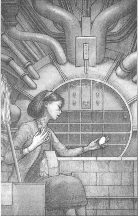 Продължава напред, докато двуфутовият парапет не я подкосява над коленете. Повърхността на водата е неподвижна. Но не идеално неподвижна. Нужно е само да се вгледаш по-добре, наистина да погледнеш, за да видиш как диша водата. Елайза издиша, вдишва и оставя плика с обяда си на парапета. Той изхрущява, силно, все едно е забила лопата в пръстта. Тя се взира в повърхността на водата за реакция. Нищо. Бърка в плика и се мръщи на шумоленето. Нищо. Намира онова, което иска, вади го; то блещука на меката светлина. Едно твърдо сварено яйце.