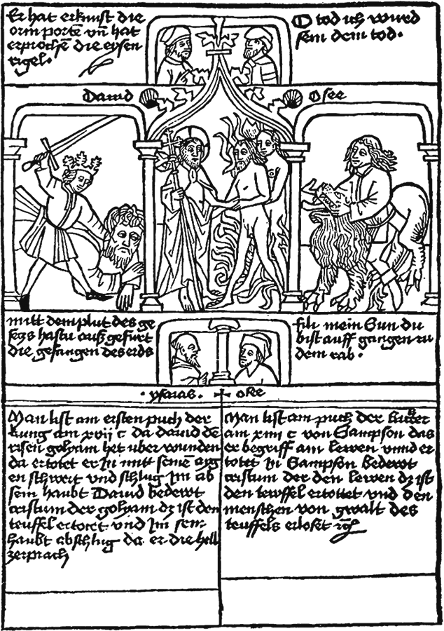 Фигура 41. Победа над чудовището: Давид и Голиат • Мъченията в ада • Самсон и лъвът (гравюра, Германия, 1471 г.)