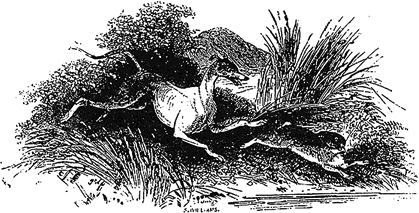 Фигура 46. Каридуен, преобразена като хрътка, гони Гуион Бах, преобразен като заек (литография, Великобритания, 1877 г.